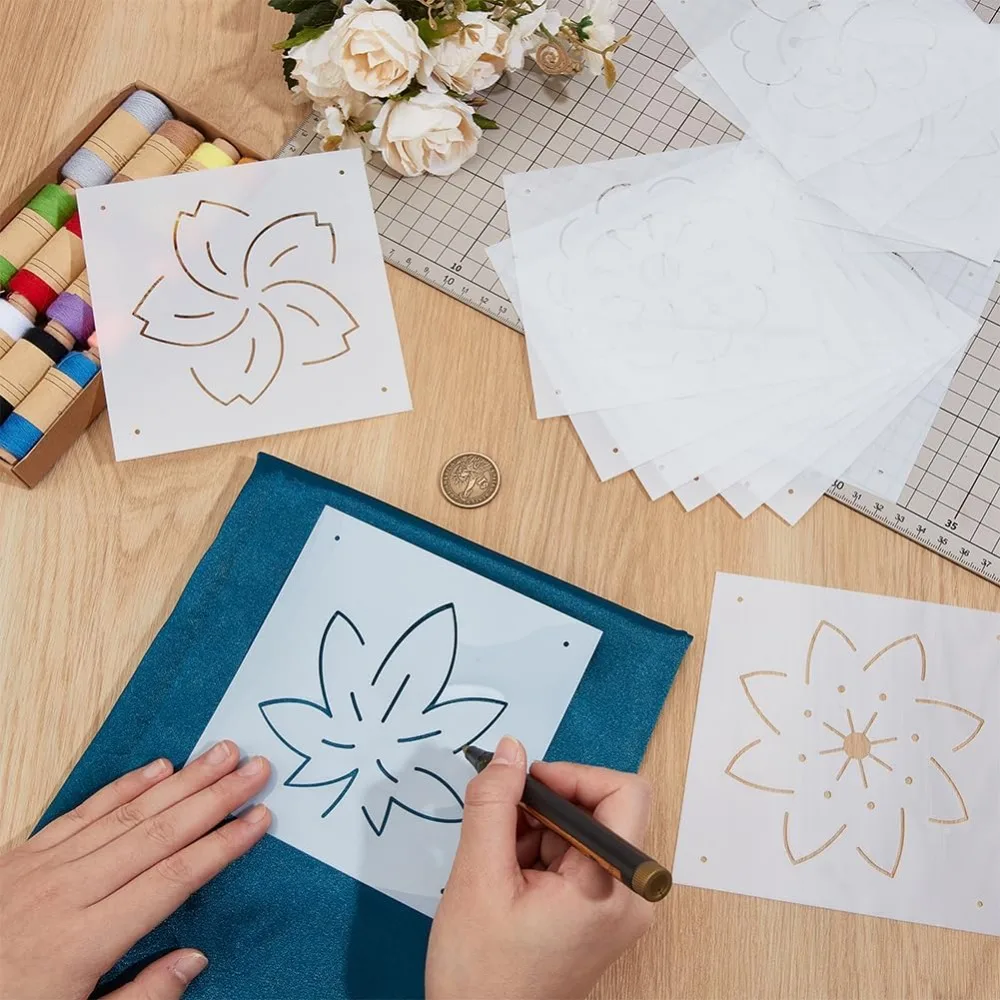 16Pcs Plastic Sashiko Stencil 5x5inch Flower Patterns Embroidery Tool Drawing Line Template for Hand Quilting and Embroidery