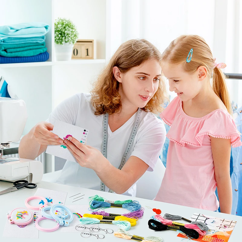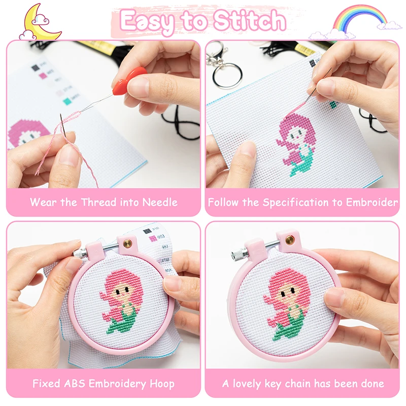 You will receive 5pcs cross stitch stamped over 3.4*3 inches space, a package of embroidery thread, 5pcs key rings, 5pcs needles, a needle threader, 5pcs embroidery tires in different colors and an instruction manual.
