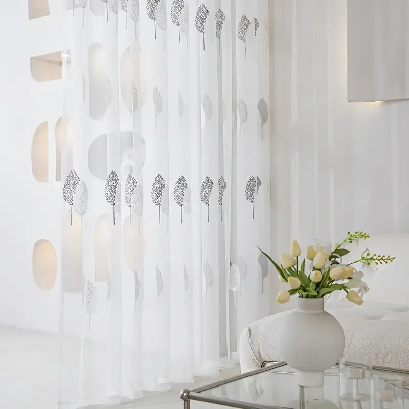 Nordic Style Leaf Embroidered Sheer Curtain, Dustproof UV Protection Polyester Fabric, Light Blocking Transparent Window Decor